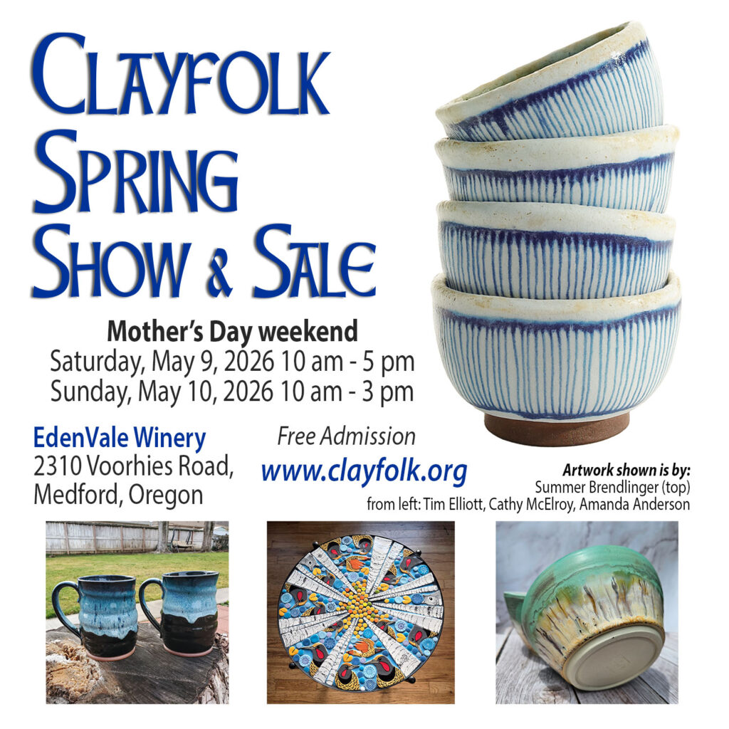 Clayfolk presents the 5th annual outdoor SPRING SHOW AND SALE at EdenVale winery on Voorhies Road in Medford. Saturday, May 9th 10:00-5:00 and Sunday, May 10th 10:00-3:00 . Over 50 ceramic artisans will show a wide range of work throughout the gardens. Rain or shine. Wine and food will be provided by EdenVale for purchase. Artist galleries and more information at Clayfolk.org